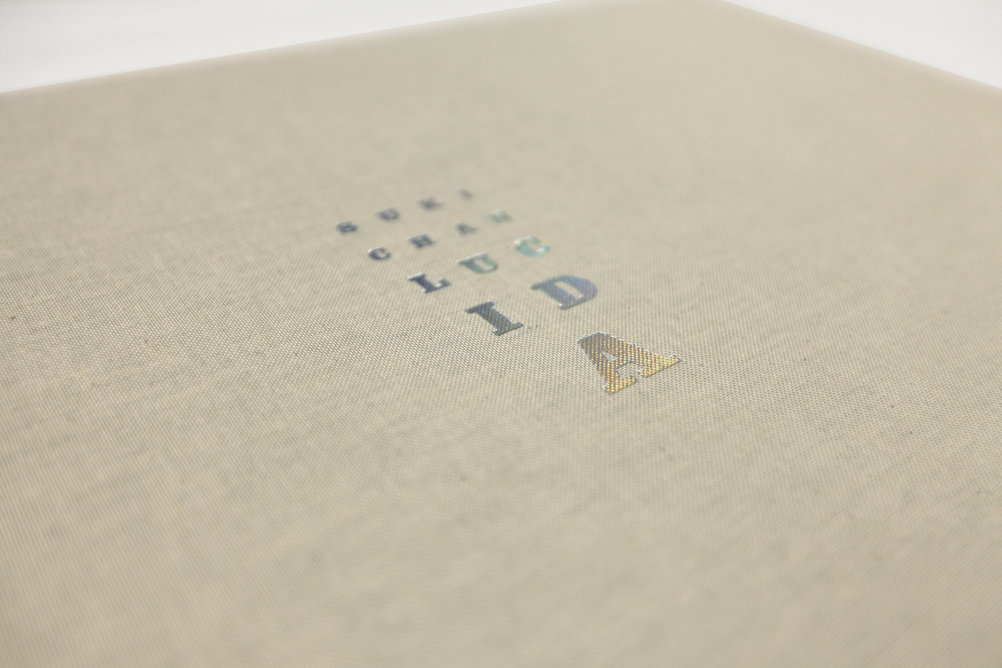 The Solander box is covered in a combination of Windsor bookcloth by Ratchford and Natuur Linen by Winter & Co., made using 2.8mm acid-free millboard. Debossed front and back cover.
